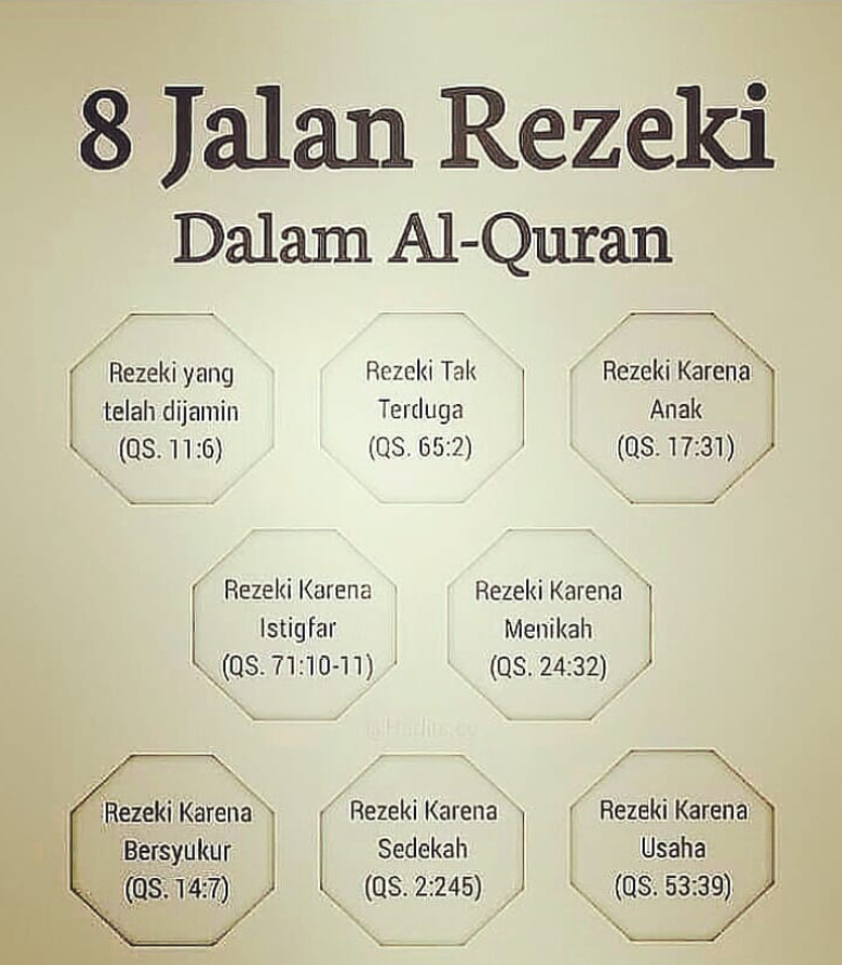 - Ketentuan Allah: Al-Quran mengajarkan bahwa rezeki sudah ditentukan oleh Allah. Dalam Surah Hud (11:6), Allah menyatakan bahwa tidak ada makhluk yang hidup di bumi yang tidak memiliki rezekinya.